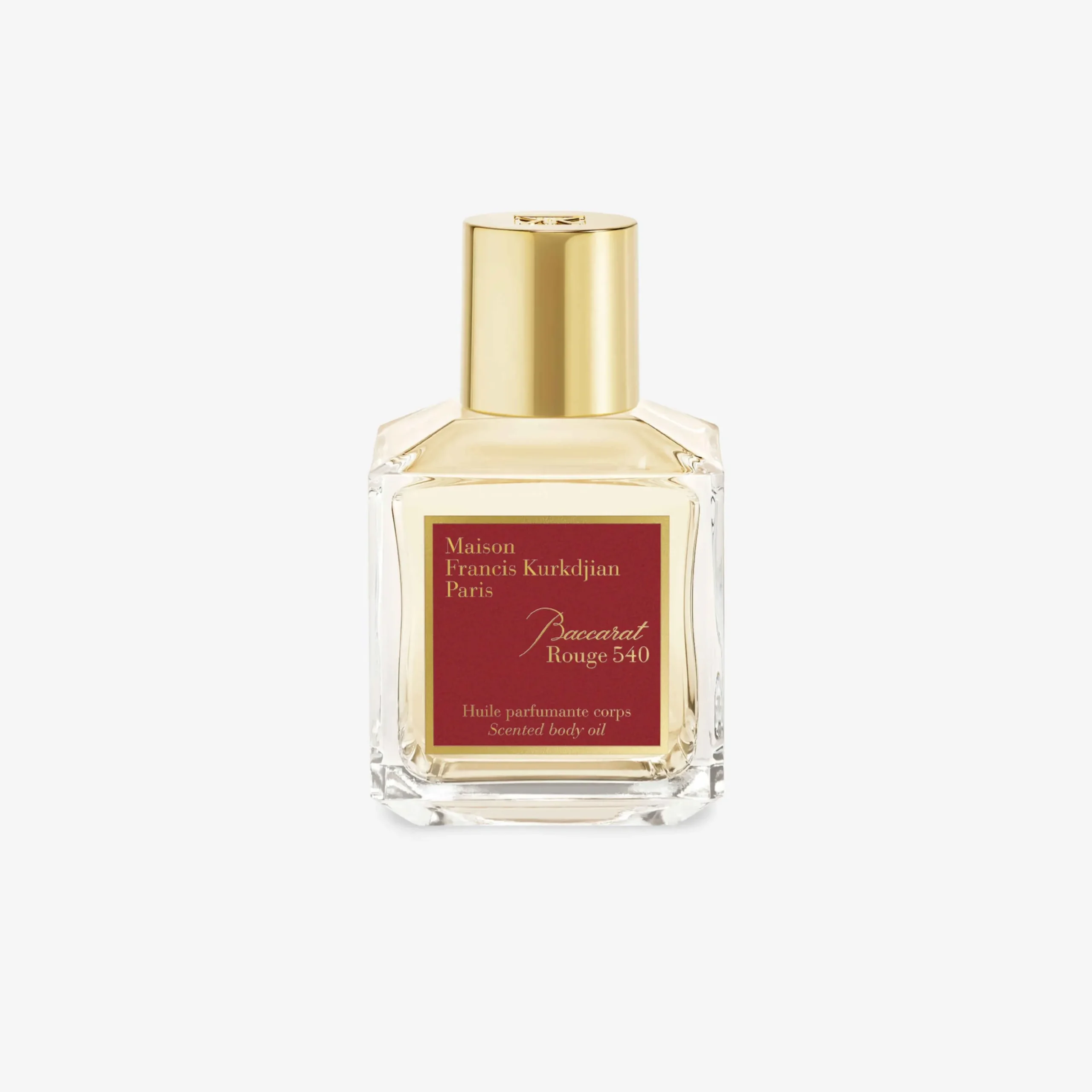 Baccarat Rouge 540 body oil delicately perfumes the skin with its light texture, leaving it softer and more radiant. Spray the oil onto the skin and gently massage in. A graphic and highly condensed signature. Baccarat Rouge 540 lays on the skin like an amber floral and woody breeze. The aerial notes of jasmine and the radiance of saffron carry mineral facets of ambergris and woody tones of freshly cut cedar wood. Baccarat Rouge 540 scented oil, held in the House’s iconic glass bottle, is composed of sweet almond, macadamia, virgin argan and apricot kernel oils.