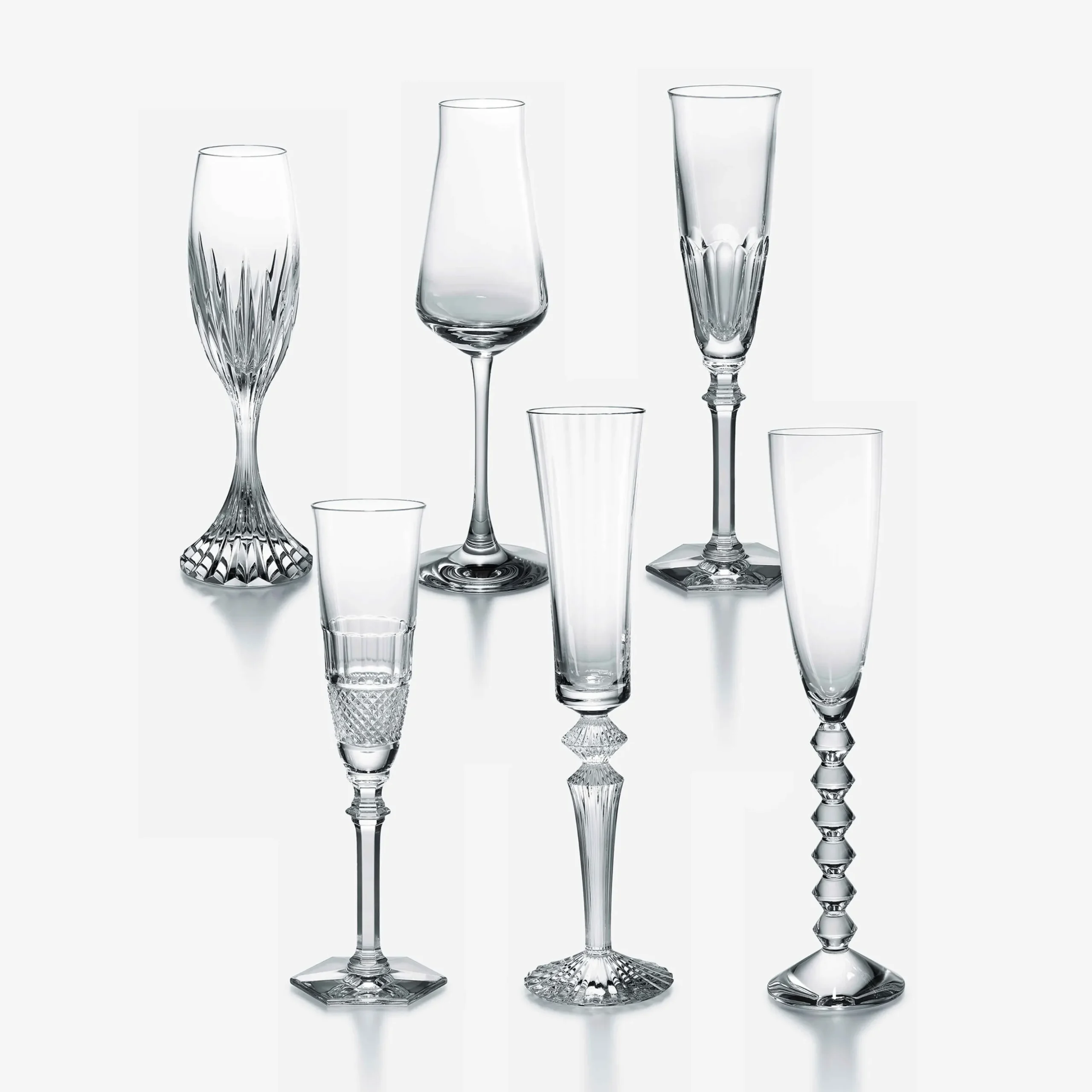 For night-owls and party lovers, Baccarat has dreamed up an exceptional set of six champagne glasses. Champagne, Royal Mojito or Bellini, amaze your guests and give your parties a real buzz all night long. The ideal gift to add a little sparkle to life. This box contains 6 flutes: a Mille Nuits 2810597, Vega 2811802, Harcourt Eve 2802588, Diamant 2807400, Château Baccarat 2611149 and a Massena 2811797.