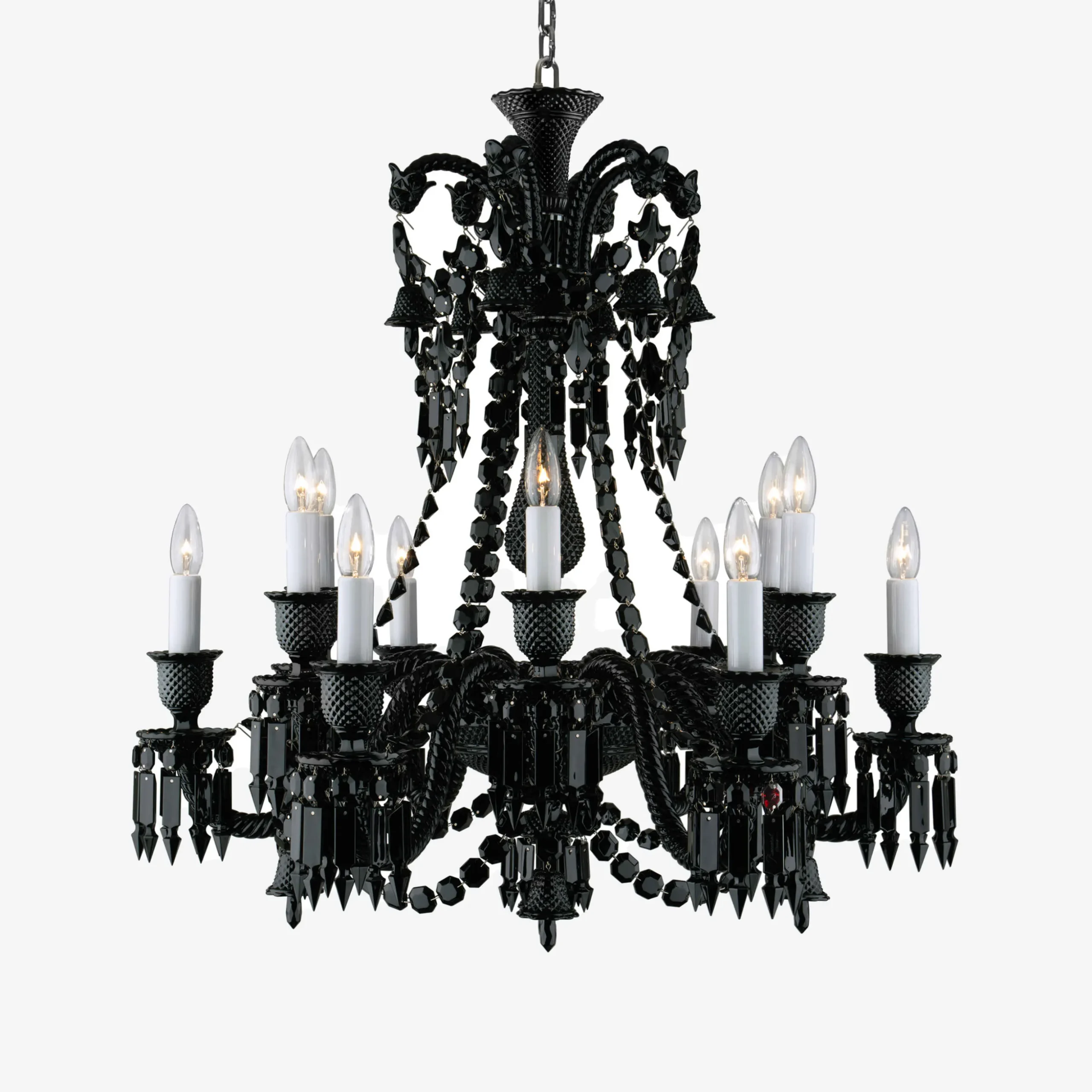 Modernizing the traditional Zenith line, Philippe Stark uses smoky black crystal to reinterpret a Baccarat icon. Maintaining the chandelier’s original structure and ornamentation, Starck adds black shades lined with aluminum reflectors to magnify the effect of light on the black crystal (must be ordered separately). Baccarat’s signature red octagonal crystal is here linked to a spiked prism, specially designed by Starck. The 24-light chandelier is a stunning and bountiful showcase of black crystal. The ‘anti-chandelier’ par excellence, black crystal is the exact antithesis of the translucence of Clear crystal. Black instead imbues this classical shape with great power, revealing its sculptural dimension in a whole new way. The chandelier is a truly decorative object, a dazzling sculpture.