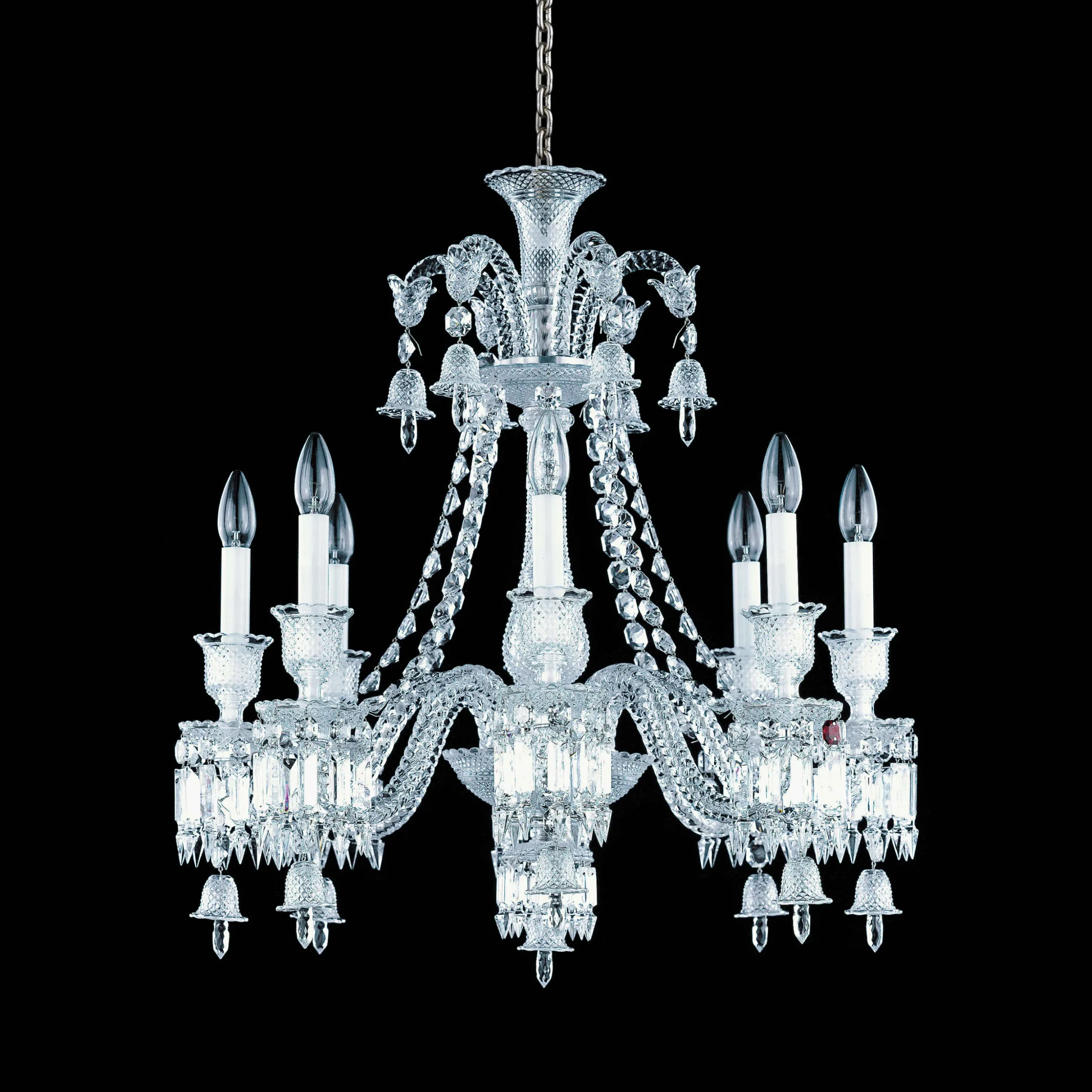 The chandelier is a truly dazzling decorative piece the luminous Clear crystal a revelation sculptural splendor. The composition of this chandelier may range immensely from 6 to 48 lights. Regardless of scale, the chandelier has a central column of cut crystal that resourcefully masks all functional cables. The wealth of ornamentation is enthralling, festooned with chiseled prisms, sparkling pendants, and Baccarat’s signature single red octagonal crystal hung discreetly. The chandelier may be displayed with white taffeta shades (must be ordered separately) for added majesty, and a long version of the Zenith chandelier is also available.
