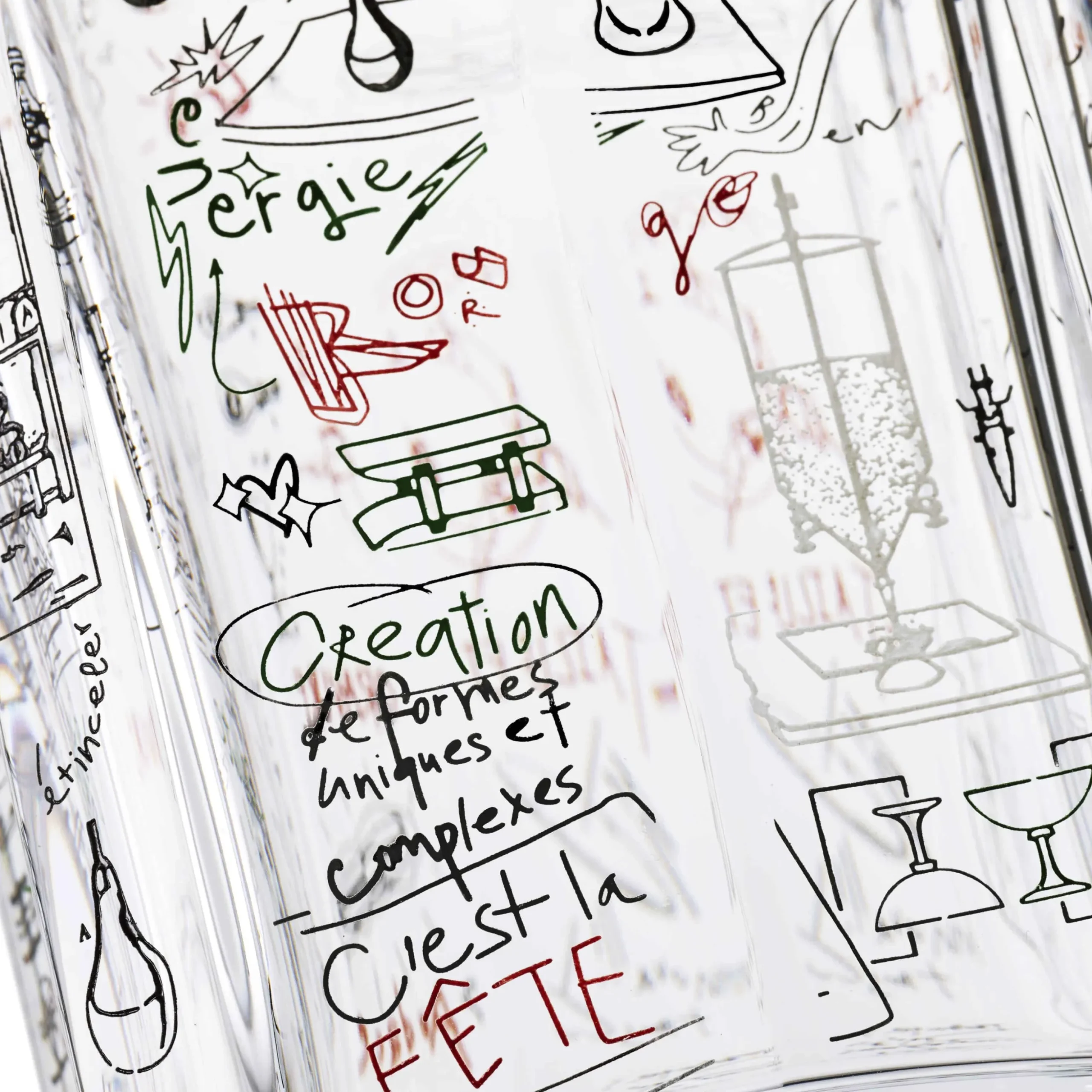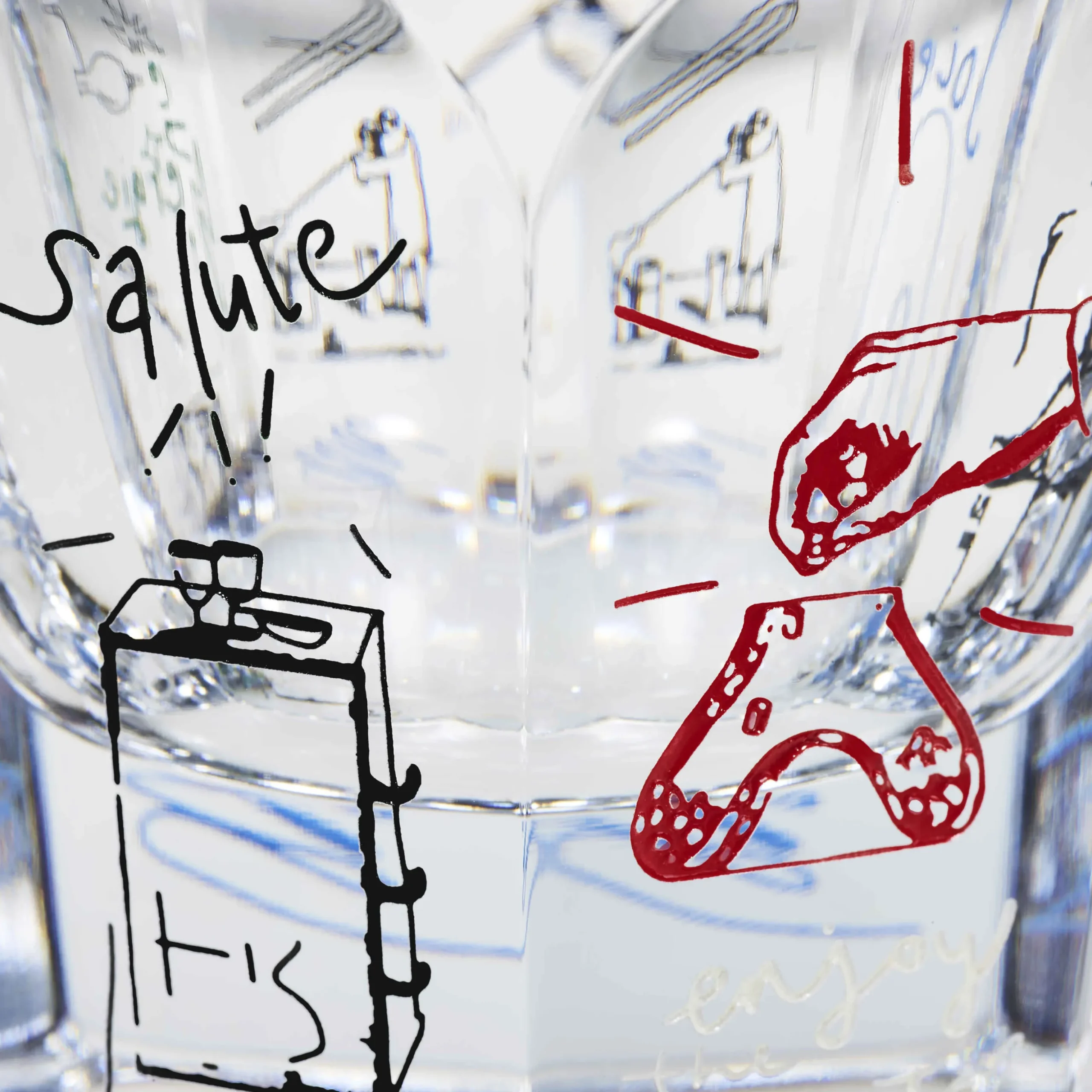 Harry Nuriev revisits the Harcourt tumbler and carafe, and the Sirius crystal ball, using the same graphic language he did for the Maison Baccarat entryway installation. Harcourt, the Baccarat icon, and Sirius, a symbol of the purity of crystal, become new means of artistic expression through his eyes. In the gilding ateliers of the Manufacture, artisans bring his vision to life, engraving and enameling, in black or in color, words such as salute, enjoy the moment, celebration, charm, alongside patterns and depictions of gestures symbolic of the Baccarat universe. Between heritage and reinvention, Harry Nuriev celebrates the Maison’s creative freedom and pays tribute to the savoir-faire of its collective, making emotion visible, and precious.
