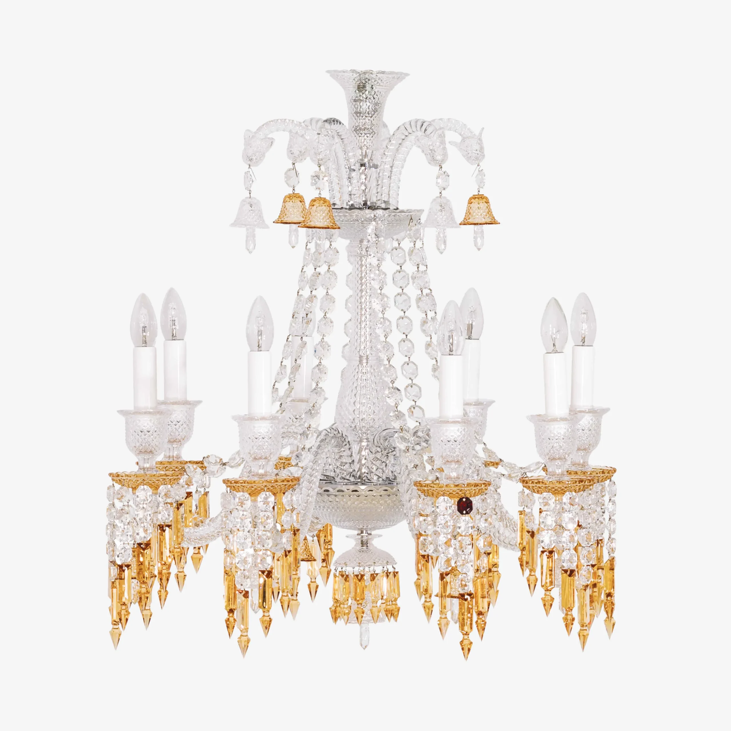 Charleston collection is inspired by the twenties’ age of splendor and prosperity. Chandeliers, floor candelabra and sconces are adorned with “champagne draped-prisms” reminding us long pearl necklaces, draped dresses of Charleston dancers. This collection also pays tribute to the creations of Georges Chevalier, his boldness and genius in particular through Jets d’eau collection. The latter is also in the history of the Maison Baccarat and its private mansion. Indeed, Marie-Laure de Noailles, the owner of this place during this period, was actively involved in the expansion of this movement conducive to creativity, art and renewal. In this spirit the Charleston chandelier has been chosen to adorn the first Baccarat Hotel in New York. The color is a main element in the creation of this new collection. “Charleston” is characterized by a champagne color that plunges us into the splendor and atmosphere of the Roaring Twenties. As the legendary gilded red, Baccarat champagne color is obtained thanks to the union of gold and crystal.